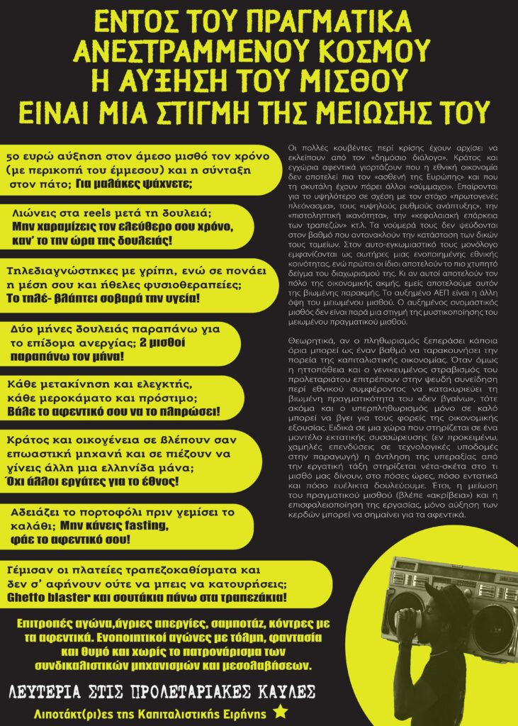 Η ενασχόλησή μας με τον πόλεμο και η συγκεκριμένη προλεταριακή/αντιπολεμική οπτική μας δεν προέκυψε φυσικά σε ιστορικό κενό. Οι περισσότερες από μας είχαμε συνυπάρξει την προηγούμενη τετραετία συμμετέχοντας σε αγώνες ενάντια σ’ έναν άλλου είδους πόλεμο, παγκόσμιας έκτασης, που διεξήχθη σε συνθήκες καπιταλιστικής «ειρήνης»: μια γενικευμένη επιχείρηση υγειονομικού καταναγκασμού συνδυασμένη με την ακόμα μεγαλύτερη συμπίεση του άμεσου και του κοινωνικού μισθού και την ενίσχυση του διευθυντικού δικαιώματος των αφεντικών, αρχικά στη βάση του διαχωρισμού μας σε πειθαρχημένες (υγειονομικά πιστοποιημένες) και σε απείθαρχες εργαζόμενες.
