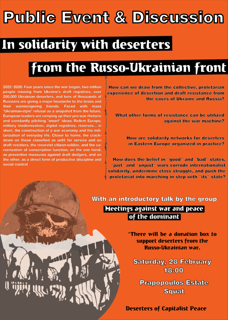 How can we draw from the collective, proletarian experience of desertion and draft resistance from the cases of Ukraine and Russia? What other forms of resistance can be utilized against the war machine? How are solidarity networks for deserters in Eastern Europe organized in practice? How does the belief in “good” and “bad” states, “just” and “unjust” wars corrode internationalist solidarity, undermine class struggle, and push the proletariat into marching in step with “its” state?